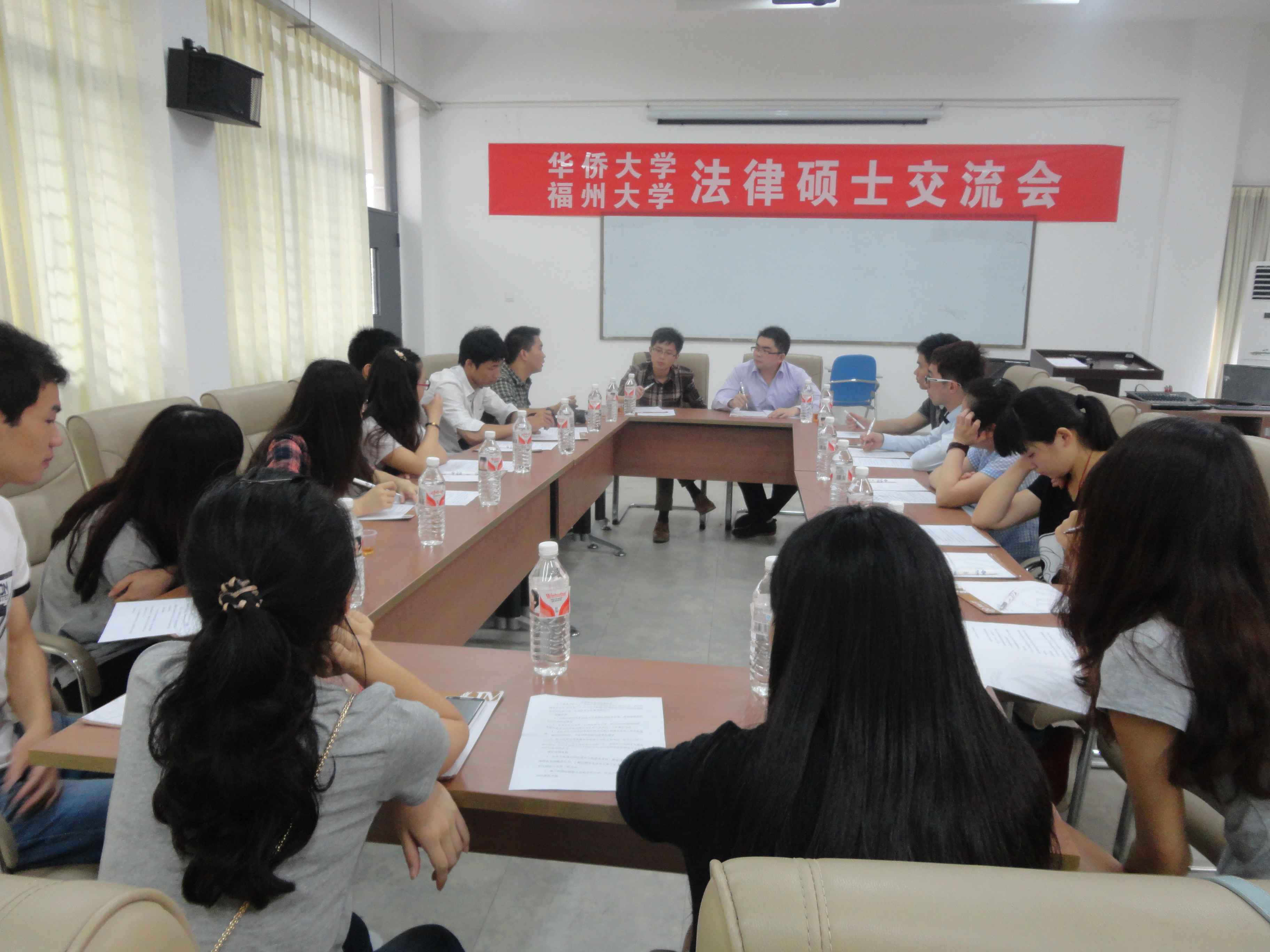 两校学子就平时校园生活、学习及学生工作展开了热烈讨论,相互传递经验,弥补不足,尤其在如何促进两校进行有效的资源共享和学术互动进行了深入交流。这对华大和福大的法硕学生的就业去向、就业过程中的遇到的障碍有更清晰的认识,了解法硕学生在学习和工作中的需求,确定今后法硕联合会的工作方向是很有帮助的,活动最终确立了两校法硕联合会的合作共识。