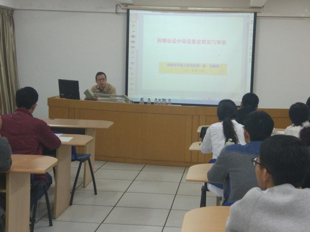 为了拓宽法硕研究生的法律实务视野,2017年3月28日晚上七点,我院邀请到泉州市中级人民法院刑一庭副庭长许新明法官作了题为《刑事诉讼中常见鉴定意见与审查》的专题讲座,2015级全日制法硕研究生到场听课。
